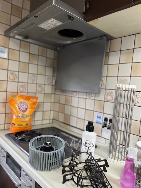換気扇周からスタート コンロ周りと大嫌いな窓とサッシ。よく出入りする庭に出る窓が開きにくくなってて、ご近所のお助けご用聞きの方に依頼。戸車変えてもらう。築年数えげつないから、部品注文も一苦労だった模様。